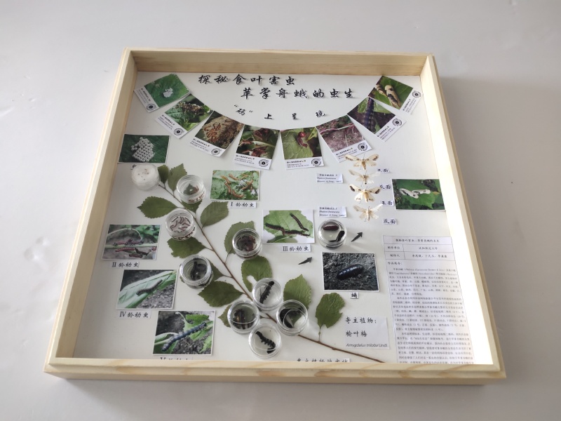 本作品首次在利用沈阳师范大学官网发布的视频,结合通过野外采集与养殖相结合的方法获得苹掌舟蛾卵、幼虫浸渍标本,成虫的立体干制标,各虫态的生态照,以及寄主植物榆叶梅被害状压制标本来展示苹掌舟蛾完整的全变态生活史(卵;幼虫;蛹;雌、雄成虫)。