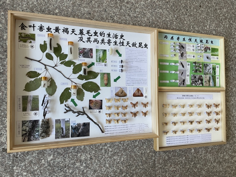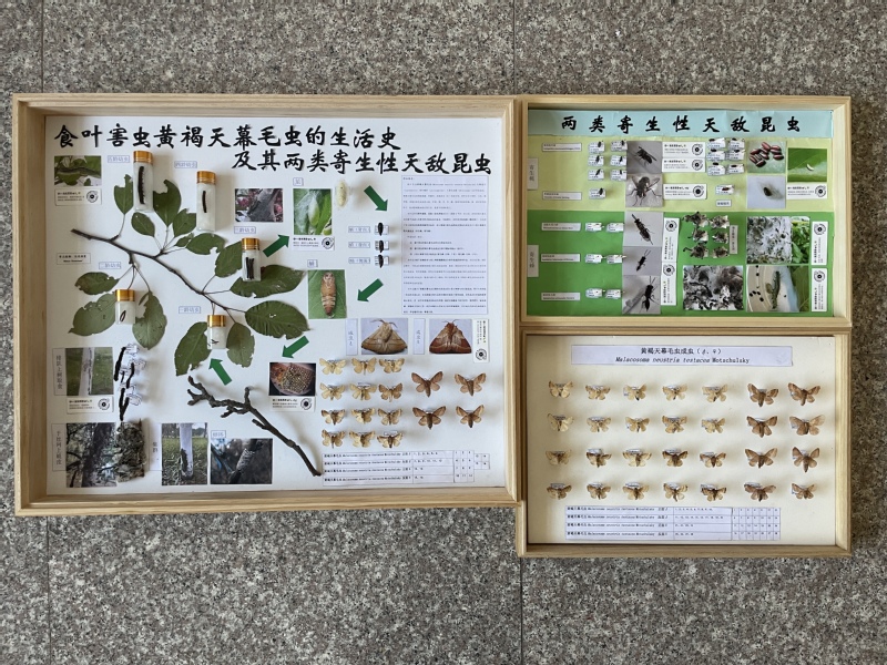 本作品利用野外观察、采集与室内养殖相结合(历时5个月)的方法,获得黄褐天幕毛虫的各个虫态及其寄生性天敌昆虫的标本、生态照片,生活习性短视频,并压制了寄主植物北美海棠的被害状标本,展示黄褐天幕毛虫的完全变态生活史及其2类5种寄生性天敌昆虫(寄生蝇、寄生蜂)。