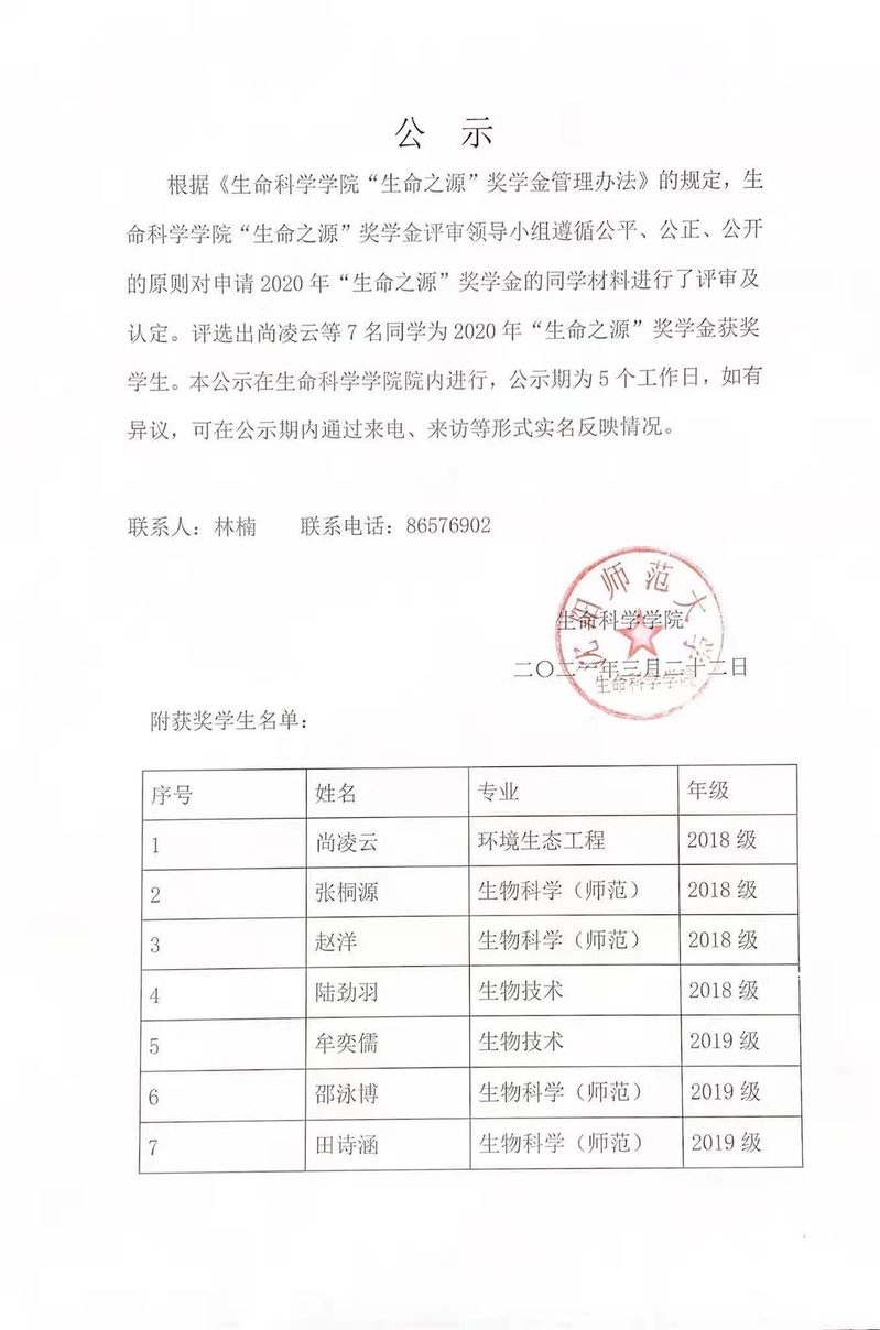 生命科学学院2020年“生命之源”奖学金获奖学生名单公示