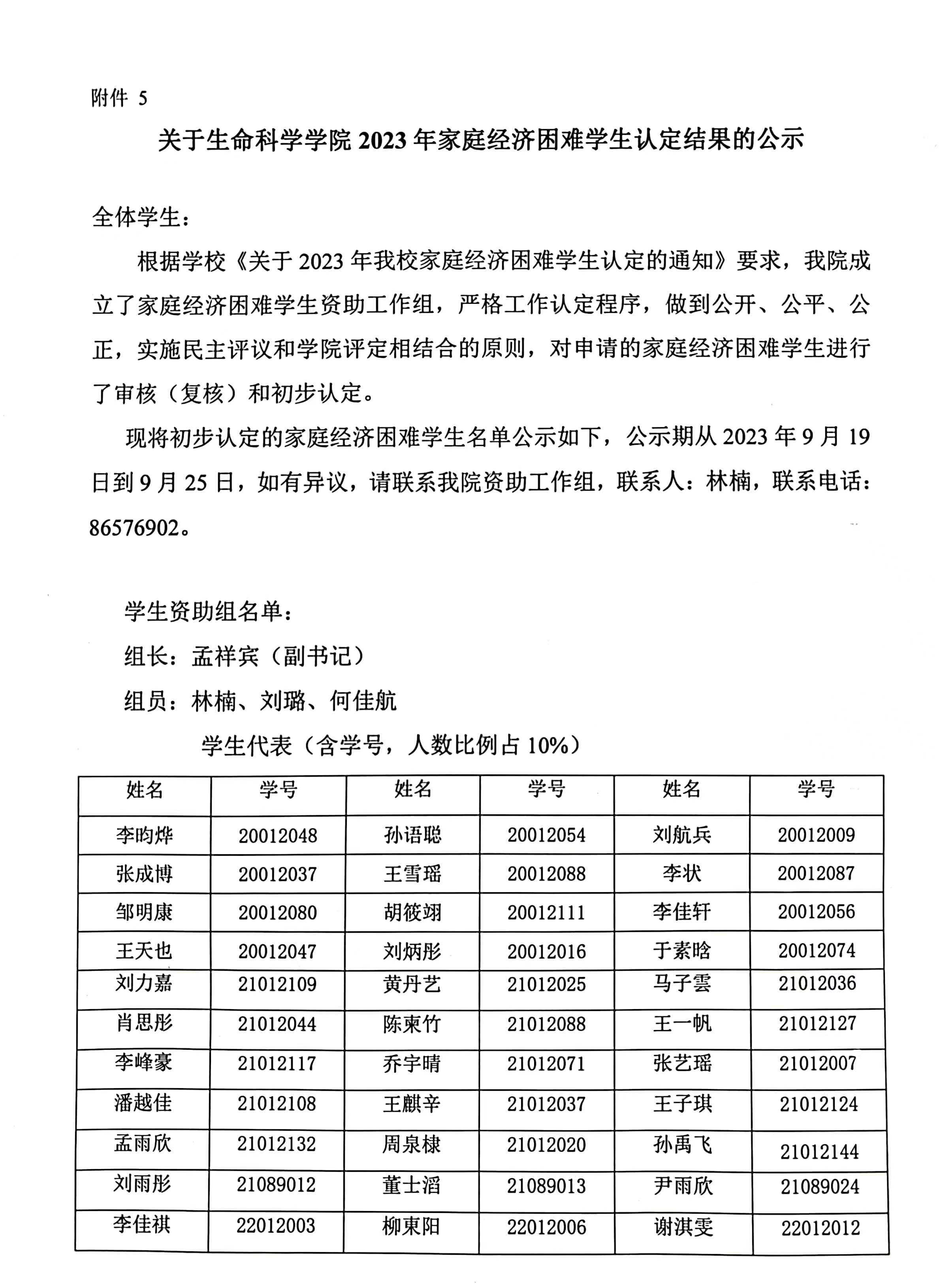 关于生命科学学院2023年家庭经济困难学生认定结果的公示