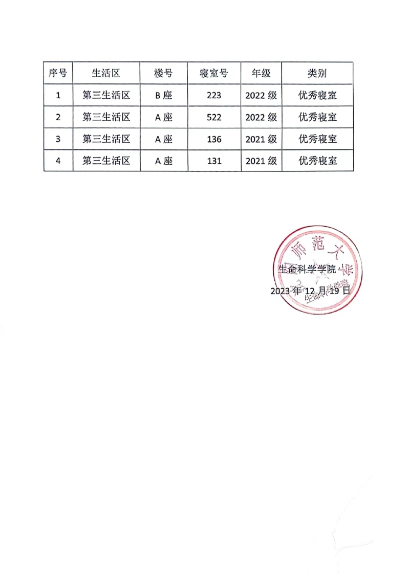 生命科学学院关于开展百个优秀寝室、百名优秀寝室长、百名优秀自管会干部活动评审结果公示