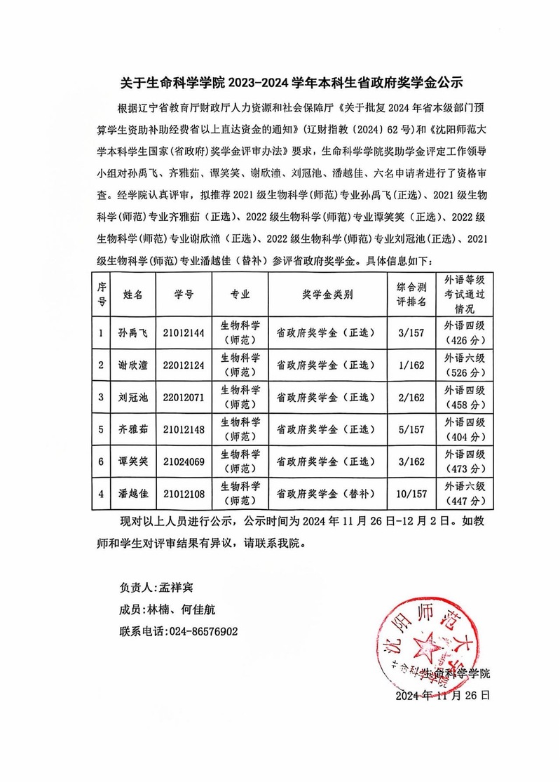关于生命科学学院2023-2024学年本科生省政府奖学金公示